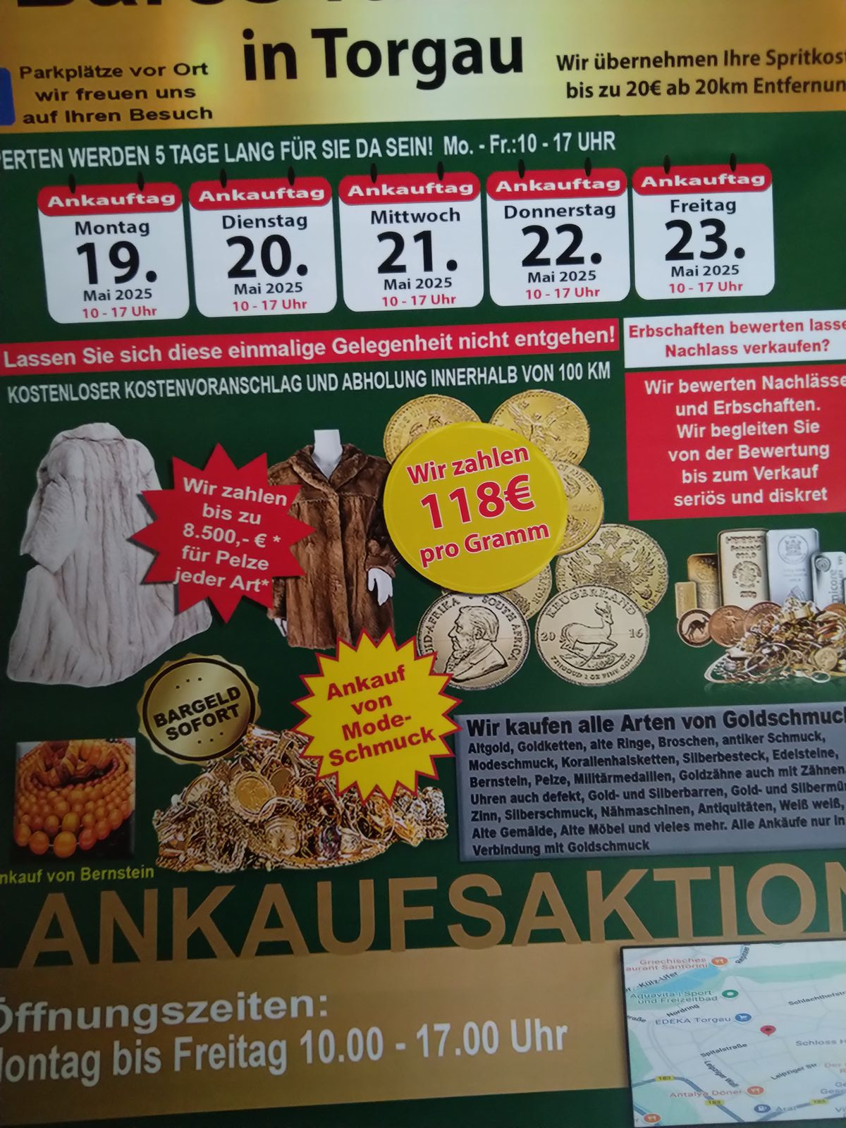 solche Vögel haben hier auch einmal inseriert. Der angegebene Gramm-Preis galt für 1g-Barren und dann wollen die dadurch erreichen, dass die Leute ihren Schmuck mitbringen, um die dann so richtig über den Tisch zu ziehen. Ich bin da aus Spaß hingegangen und habe mir seinerzeit einfach mal 25 x 1g Barren gegriffen und vor Ort gesagt, dass ich bitte die Kohle für 25 Stück 1g-Barren hätte. Reaktion: Wir haben schon so viel angekauft, dass der Ankauf erst einmal gestoppt sei