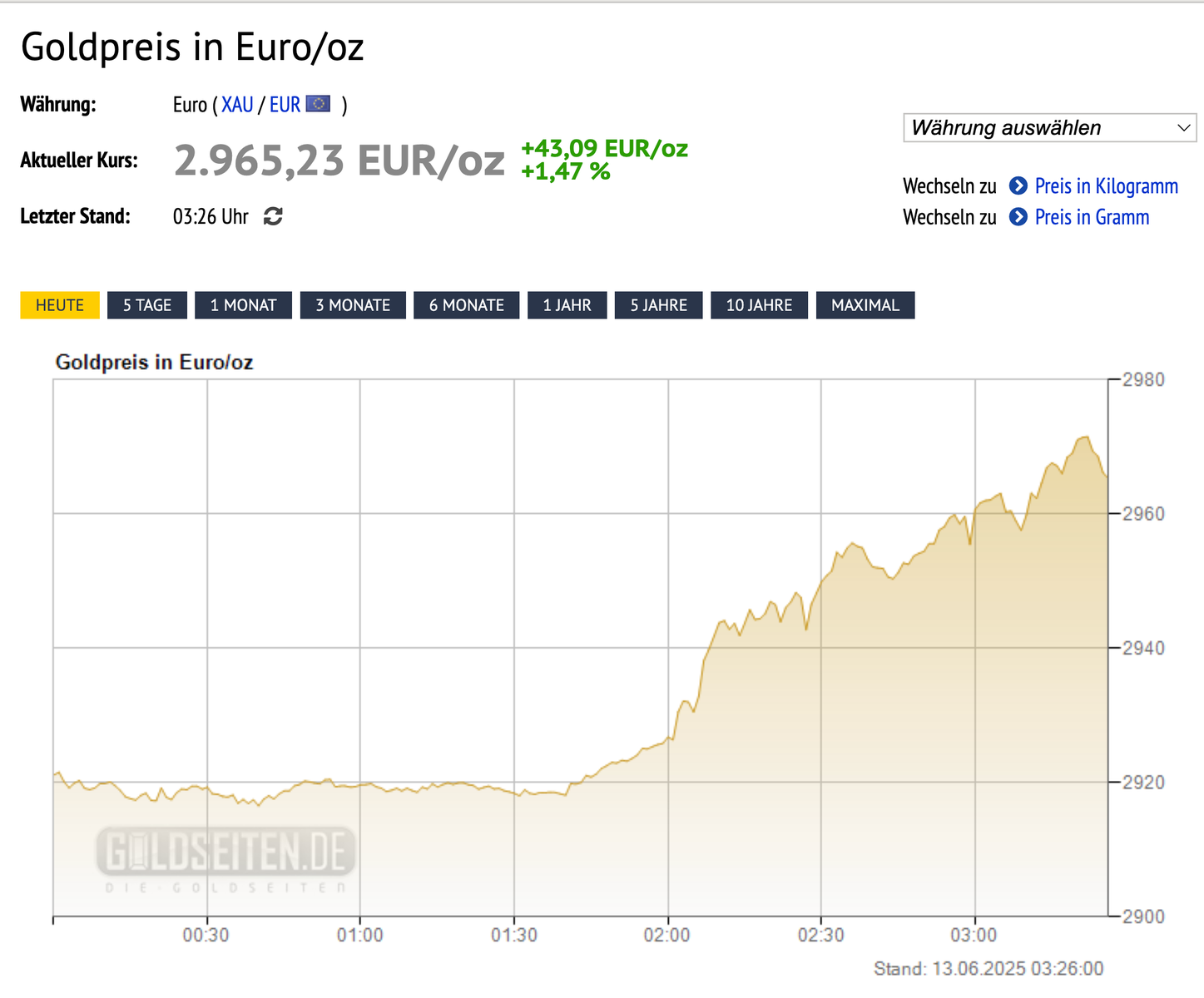 Gold macht das was man erwartet. Israel verkloppt den Iran, Gold macht einen Sprung