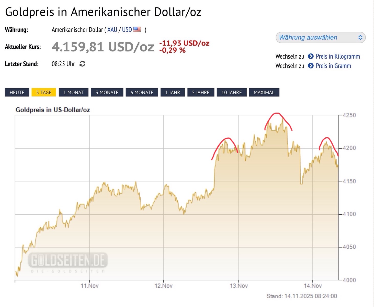 • Jetzt geht es ab, nach Süden. - Mal eben so ganz schnell 50$ Minus bei Gold.