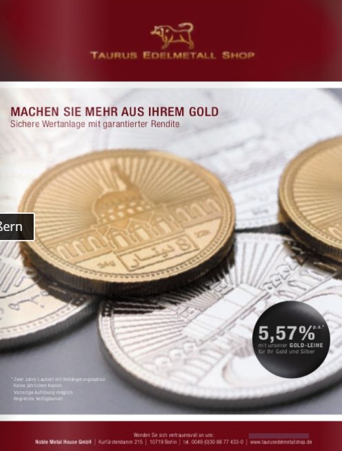 "Kunden von GoldSilberShop.de und Besitzern von Gold offerieren wir ab sofort, uns ihre Barren und Münzen in Form eines Sachdarlehens zu leihen. Im Gegenzug erhalten Sie eine attraktive Verzinsung von 3% p.a.."