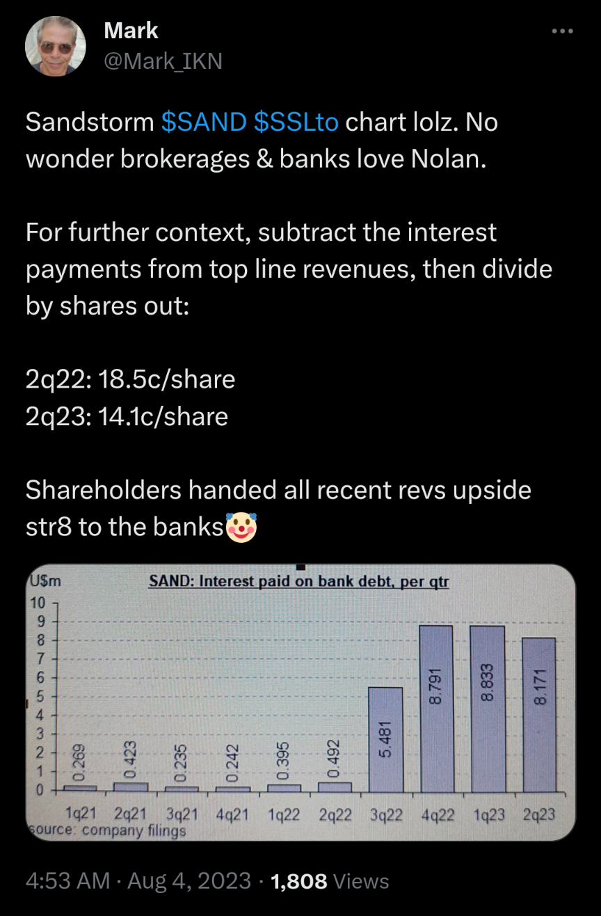 Sandstorm gehörte im vergangenen Jahr zu den Goldaktien mit der schlechtesten Wertentwicklung. Nachdem die Aktienblöcke aus dem Weg geräumt sind und die Bewertung spottbillig ist, hat sich das Chancen-Risiko-Verhältnis erheblich verbessert.
