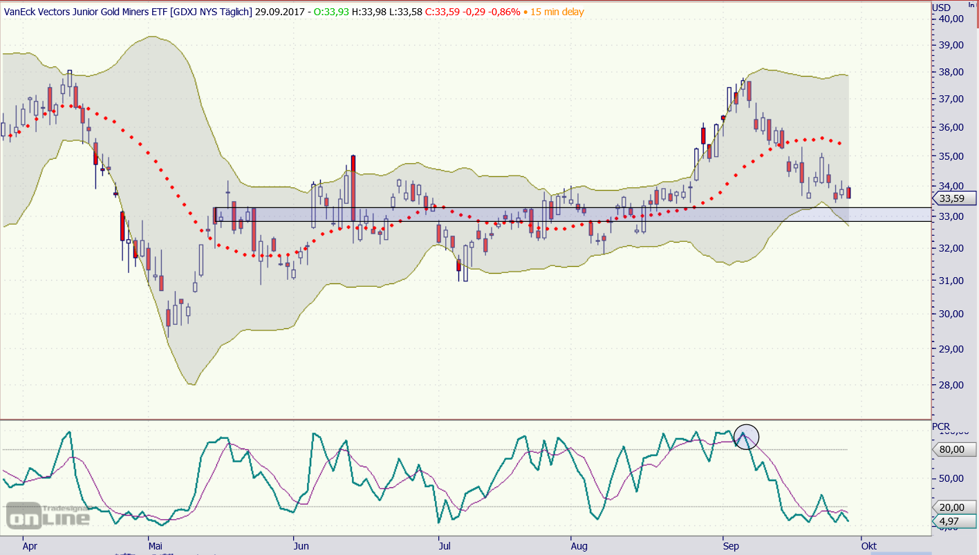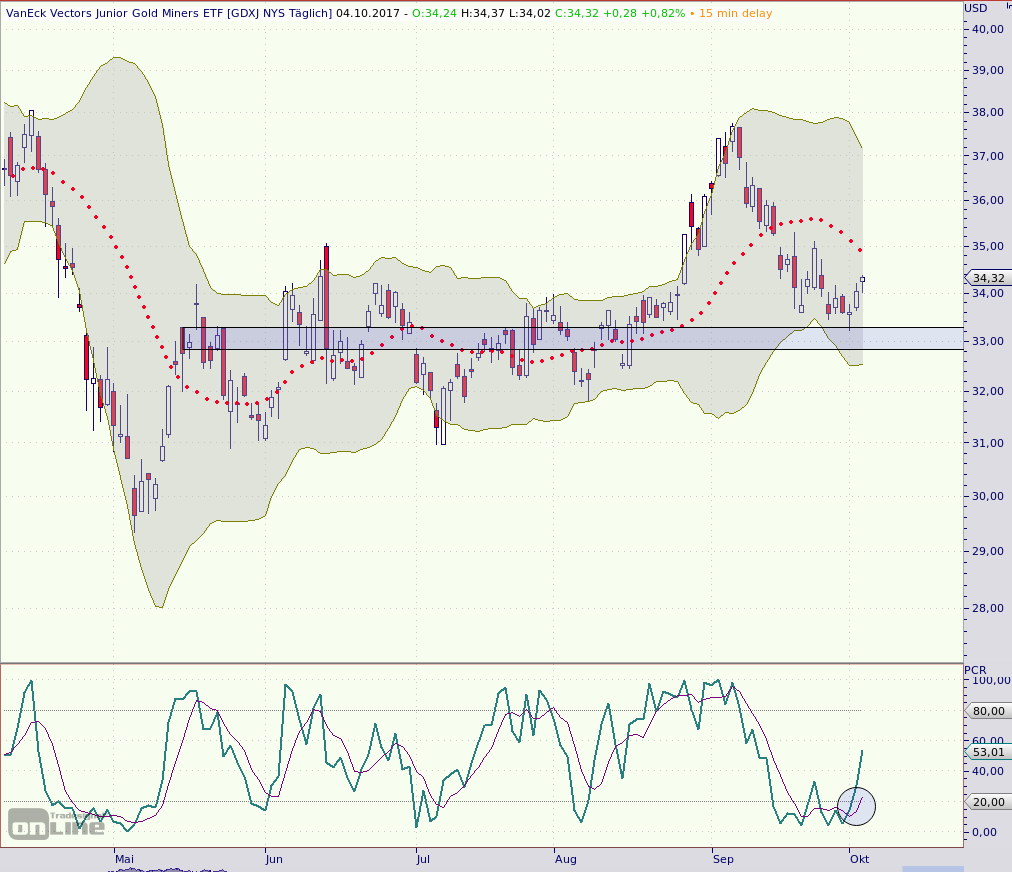 Kaufsignal beim GDXJ, der Momentumindikator ist über 50 gestiegen.