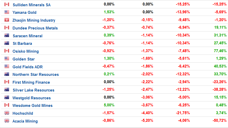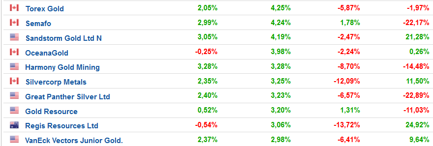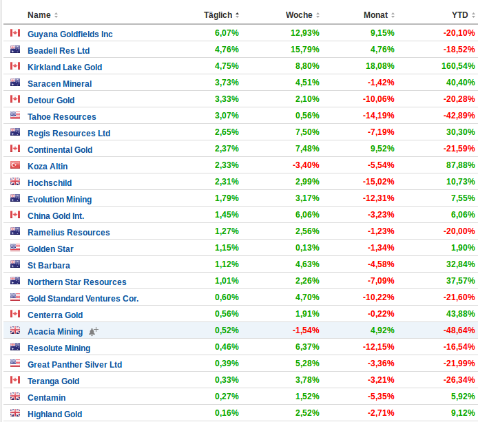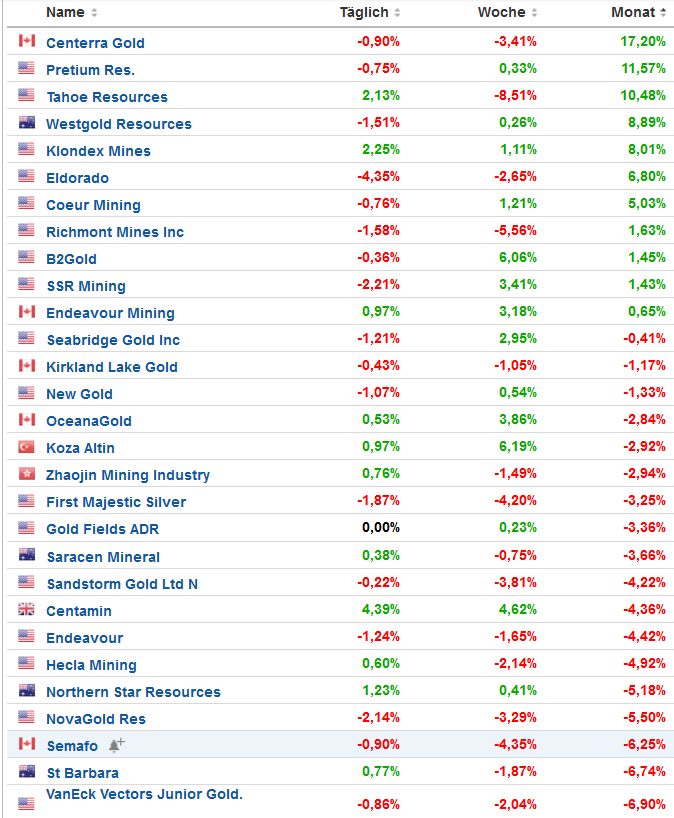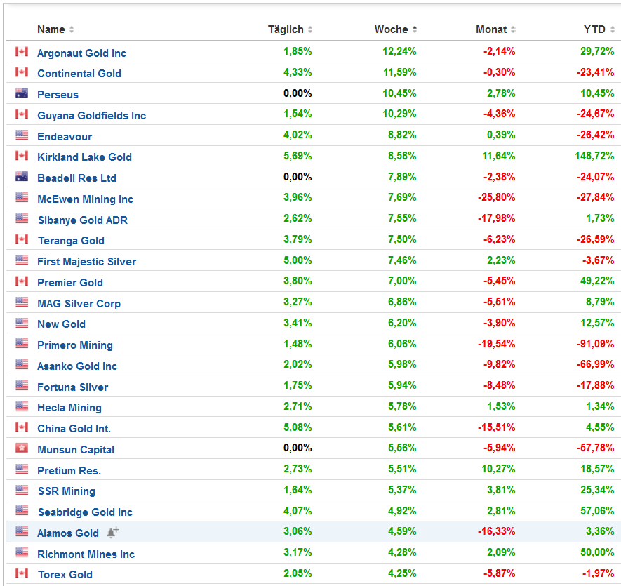In der Tabelle sind jetzt alle Werte des GDXJ vertreten. Nur die Daten von Real Gold Mining mit 0,01 % Indexanteil fehlen.In den beiden ersten Tabellen sind die Werte mit einer besseren Performance, in der dritten Tabelle mit einer schlechteren Performance im Vergleich zum GDXJ. In der Tabelle 4 sind die Wochenverlierer.