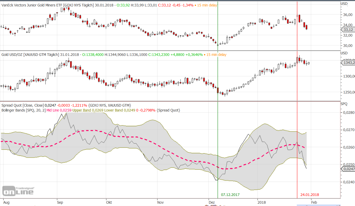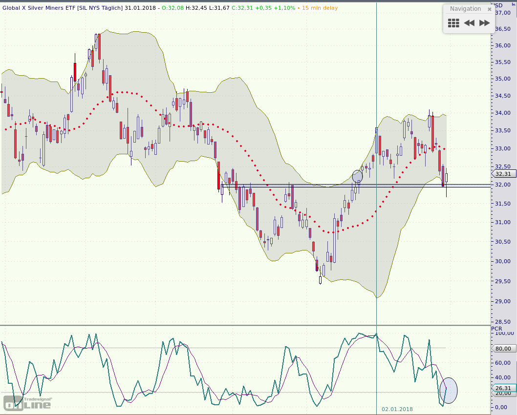 Seit dem 2.1. war das Chartbild des SIL (Global Silber Miner ETF) nicht stabil. Der Ausbruch über das letzte Hoch aus dem Dezember erfolgte mit einem Gap (Kurslücke), dann fiel die Durchschnittslinie des Momentumindikators (purpur) und die Kursbewegungen wurden immer volatiler.