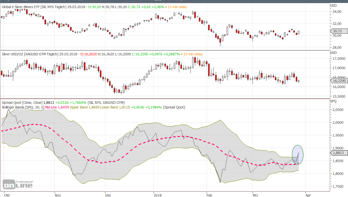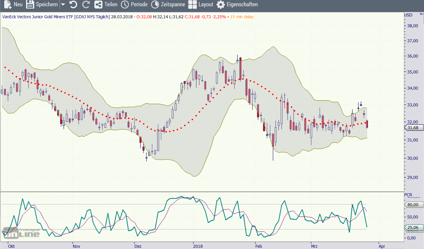 Die Quote GDXJ zu Gold ist wieder unter das mittlere Bollingerband gefallen.