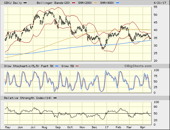Hier 3 Charts des GDXJ. Dort habe ich die 200 und 400 MAs hereingestellt, die für längerfristige Überlegungen relevant sind.
