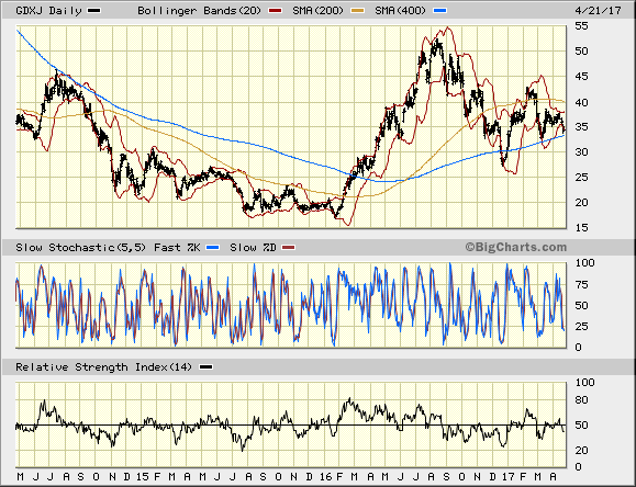 für mich sehen die Charts konstruktiv aus. GDXJ über der 400 Tage Linie, 200 Tage Line über 400 Tage Linie, GDXJ am unteren Rand des Bollingerbandes und vermutlich vor einem Kaufsignal von Slow Stochastik und Relativer Stärke. Platz sehe ich zunächst bis zum oberen Bollingerband und dann bis zur 200 Tage Linie, also gut 15 %.