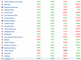 In der Tabelle sind jetzt alle Werte des GDXJ vertreten. Nur die Daten von Real Gold Mining mit 0,01 % Indexanteil fehlen.In den beiden ersten Tabellen sind die Werte mit einer besseren Performance, in der dritten Tabelle mit einer schlechteren Performance im Vergleich zum GDXJ. In der Tabelle 4 sind die Wochenverlierer.