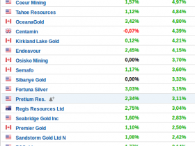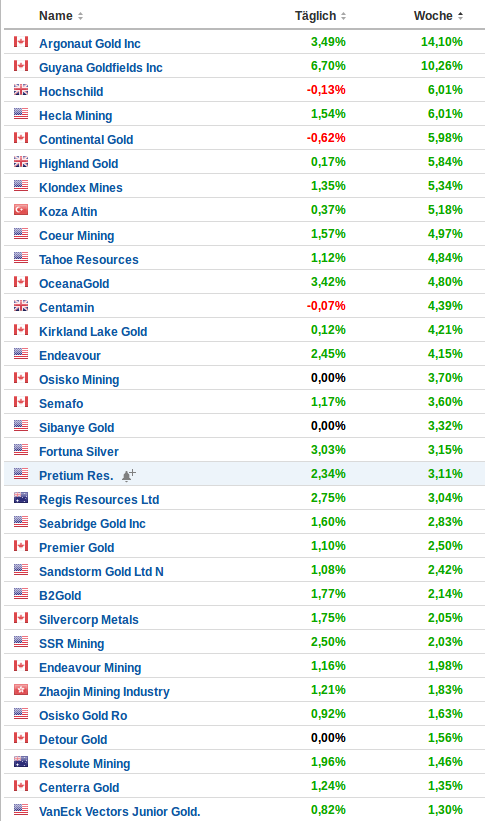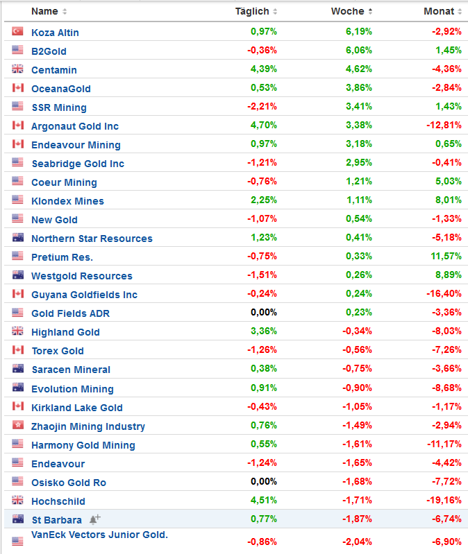 In der Tabelle sind jetzt alle Werte des GDXJ vertreten. Nur die Daten von Real Gold Mining mit 0,01 % Indexanteil fehlen.In den beiden ersten Tabellen sind die Werte mit einer besseren Performance, in der dritten Tabelle mit einer schlechteren Performance im Vergleich zum GDXJ. In der Tabelle 4 sind die Wochenverlierer.
