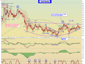 Dies würde zu Chart 3, Gold weekly, passen: Ich weiss, dass auf der linken Seite für einen schönen rounded bottom was fehlt. Insgesamt sieht dies doch recht harmonisch aus. Deshalb: Hoch in Region 1350$, danach letzter Rückgang, bevor der grosse Ausbruch erfolgt?