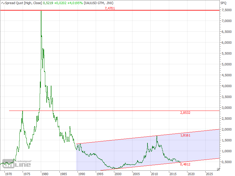 • @nicco...hier mein Gold/S&P Ratio...7:1 hatten wir in der Spitze!