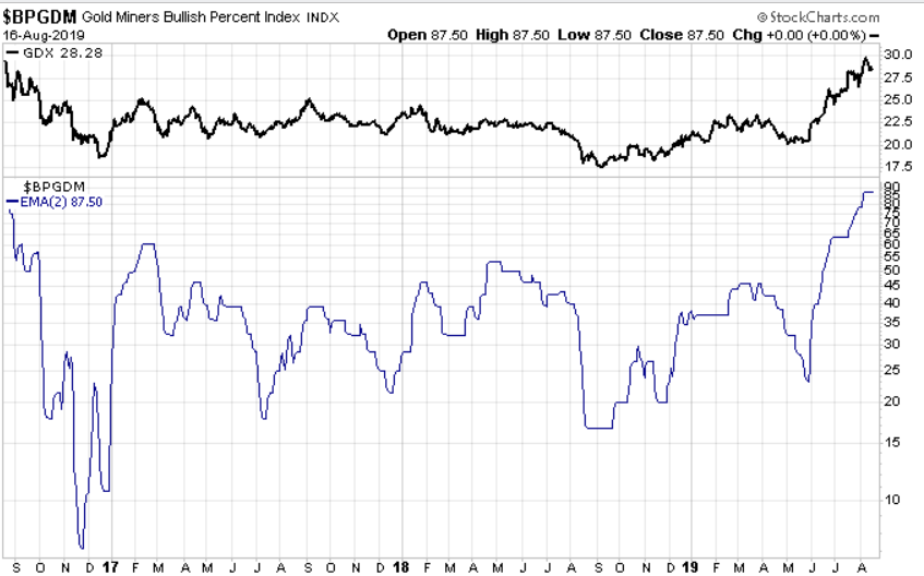 Bei einem Sentiment von ca. 20 waren Goldminen attraktiv, aber bei ca. 90 sind zu viele Optimisten an Bord.