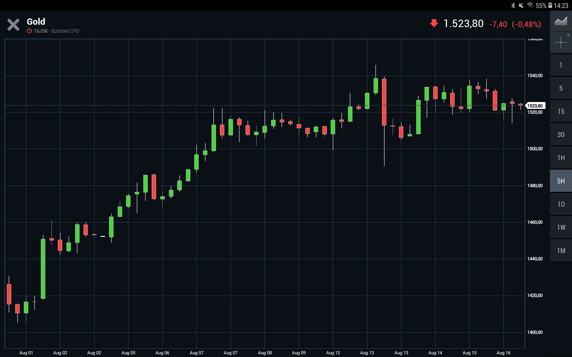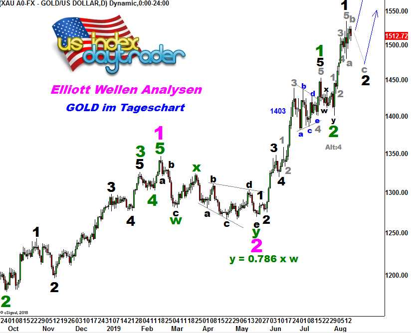 Naja, jedenfalls habe ich mir den Goldchart nochmal auf der kurzen Zeitebene genau angeschaut und vermute, dass Caldera auf folgendes, sich immer wiederholende Pattern (in seinem Post vor dem oben zitierten), anspielte: Man kann die Aufwärtsbewegung seit dem 1.August als Welle 5 (in sich wiederum fünfteilig und auch die darin wiederum sichtbaren Unterstrukturen in dieser 3 und 4 scheinen zu passen) der 3 ansehen und dann könnte die scharfe Korrekturbewegung am 13. August (er nennt dieses Datum auch in seinem Post) als Welle a der 4 angesehen werden, was bedeuten würde, dass wir gerade noch am Übergang von b in c sind und uns diese c als Abschluss der 4 noch bevorstehen könnte. Die c könnte dann zwischen 1,38 bis bis 1,62 mal so lange wie die a werden, was uns in den Bereich 1440 bis 1460 USD führen würde. Das untere Level wäre auch nah am 38%-Retracement der Welle 3. Könnte passen, muss es aber natürlich nicht.