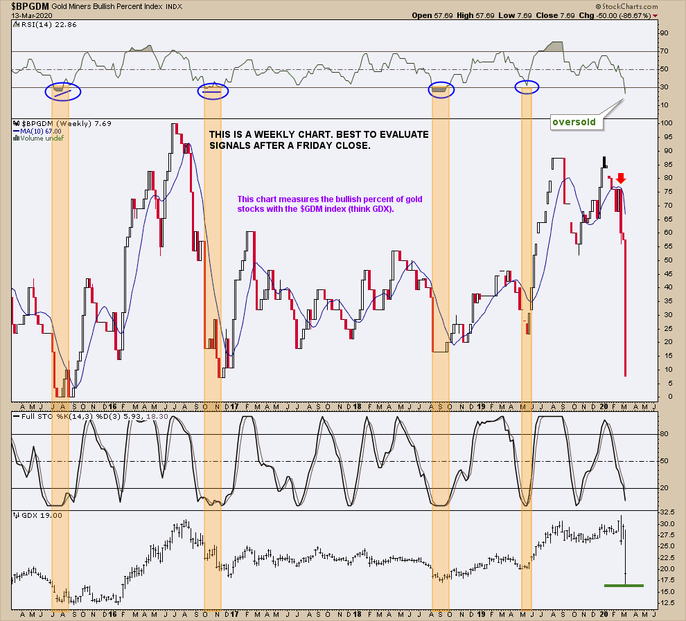 How to apply the Gold Miners Bullish Percent Index in gold trading?One of the best ways to do the above is to look for oversold/overbought conditions accompanied by additional confirmations of a trend like the Relative Strength Index and Williams %R indicator. Both indicators can provide overbought and oversold signals independently, but based on our research the signals are most reliable when both indicators based on the $BPGDM (the symbol for the Gold Mining Bullish Percent Index) confirm each other. You can see an example on the chart below.