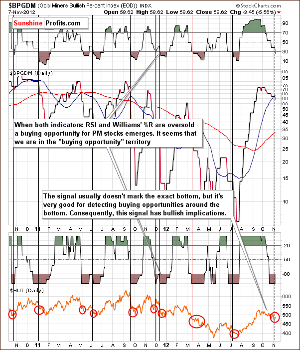 How to apply the Gold Miners Bullish Percent Index in gold trading?One of the best ways to do the above is to look for oversold/overbought conditions accompanied by additional confirmations of a trend like the Relative Strength Index and Williams %R indicator. Both indicators can provide overbought and oversold signals independently, but based on our research the signals are most reliable when both indicators based on the $BPGDM (the symbol for the Gold Mining Bullish Percent Index) confirm each other. You can see an example on the chart below.