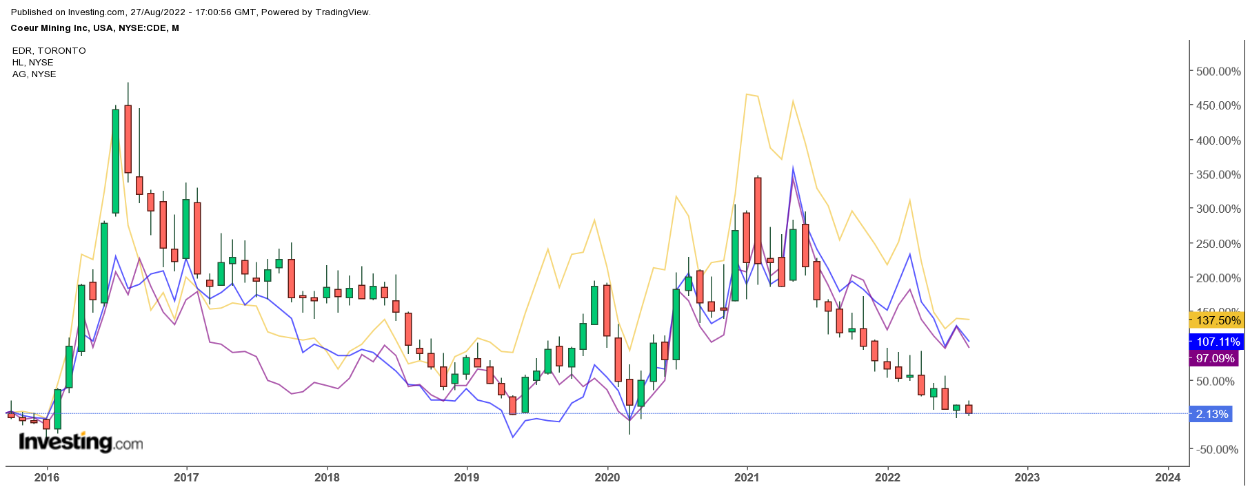 Hier die Ausschläge von Hecla, EDR, Coeur und First Majestic in heissen Phasen.