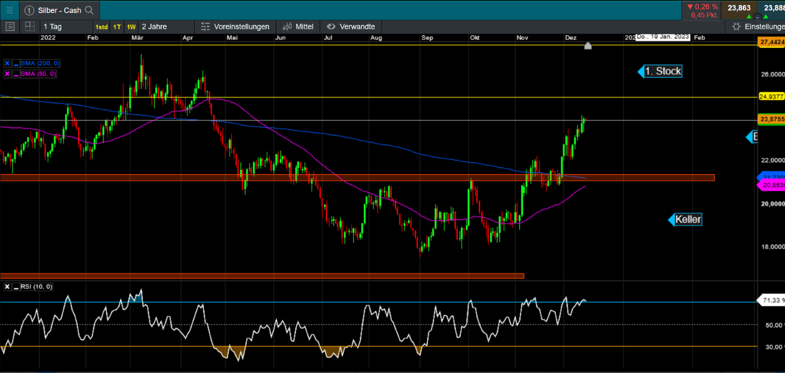 • Der Silberchart gefällt mir sehr gut. Die Bodenbildung im Sommer/Herbst war ässerst sorgfältig und robust. Wir haben uns zwar zügig den 25 $ genähert, wenn wir uns aber den RSI im Tageschart anschauen, so sind wir nicht mal sehr überkauft. Und, wir stehen vor der Bildung eines Golden Crosses.