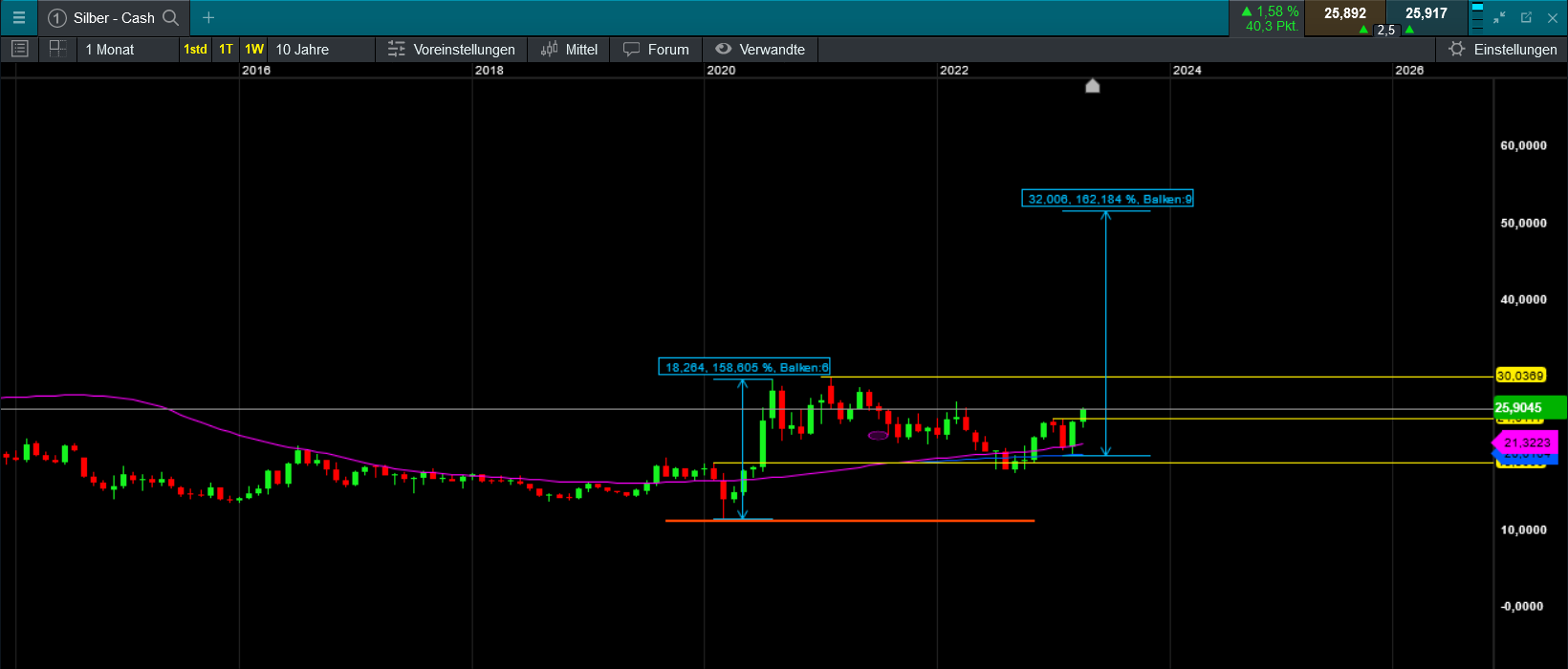 Silber stösst auch vorwärts. Wehe, wenn es losgelassen. März - Juli 2020 haben wir in einem Zug + 160 % hingelegt. Zum Vergleich: Würden wir das im jetzigen Run wiederholen, kämen wir auf über 50 $. Es ist bei Silber vieles möglich, auch wenn wir längst überkauft sind.
