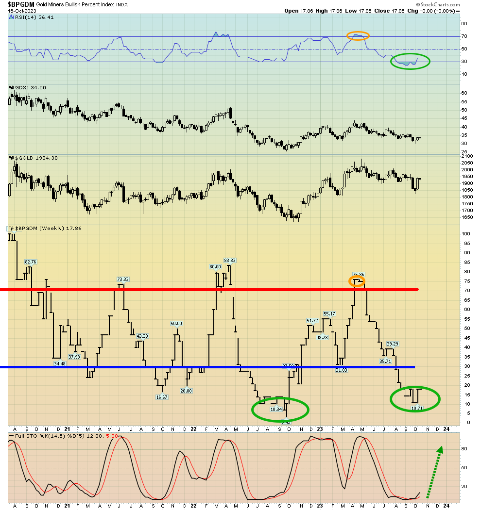 Beachten Sie außerdem die Entwicklung des BPGDM-Stochastik-Oszillators am unteren Rand des Diagramms. Ich verwende die 14,5,5er-Reihe für Wochencharts. Dieser wichtige Oszillator ist massiv überverkauft; selbst nach dem gewaltigen Anstieg bei Gold, Silber und den Minenwerten liegen sowohl die Leit- als auch die Nachlauflinie immer noch unter 20.