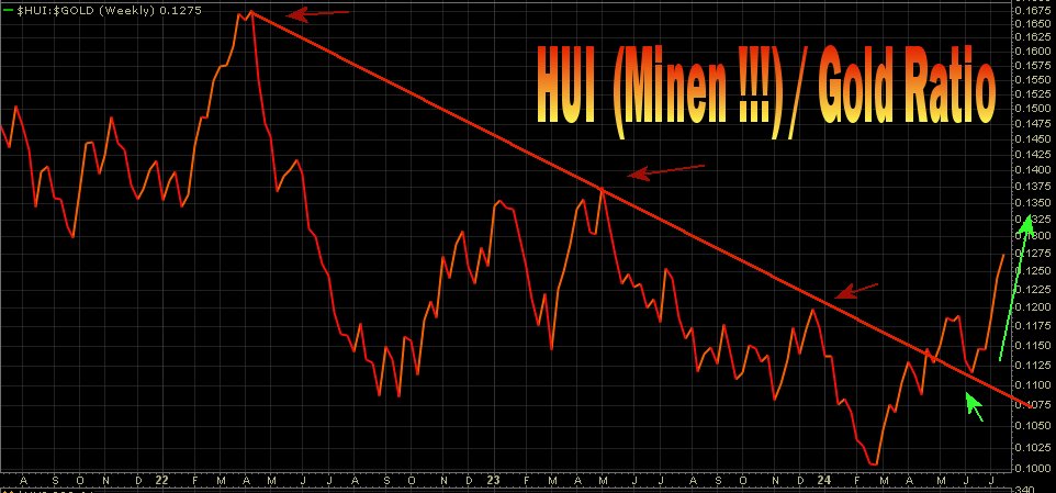 Gold ist auf ATH, richtig, und der HUI meilenweit entfernt, auch richtig . Aber wir haben seit ca. 20 Jahren Underperformance der MINEN ggü. Gold. Was erwartest Du ? Soll die in ein paar Monaten aufgeholt werden ? Musst schon richtig schauen !!! Seit MÄRZ performen die Minen besser als Gold. So fangen HAUSSEN an. Was nachher dabei rauskommen wird ? Schau‘n mr mal.