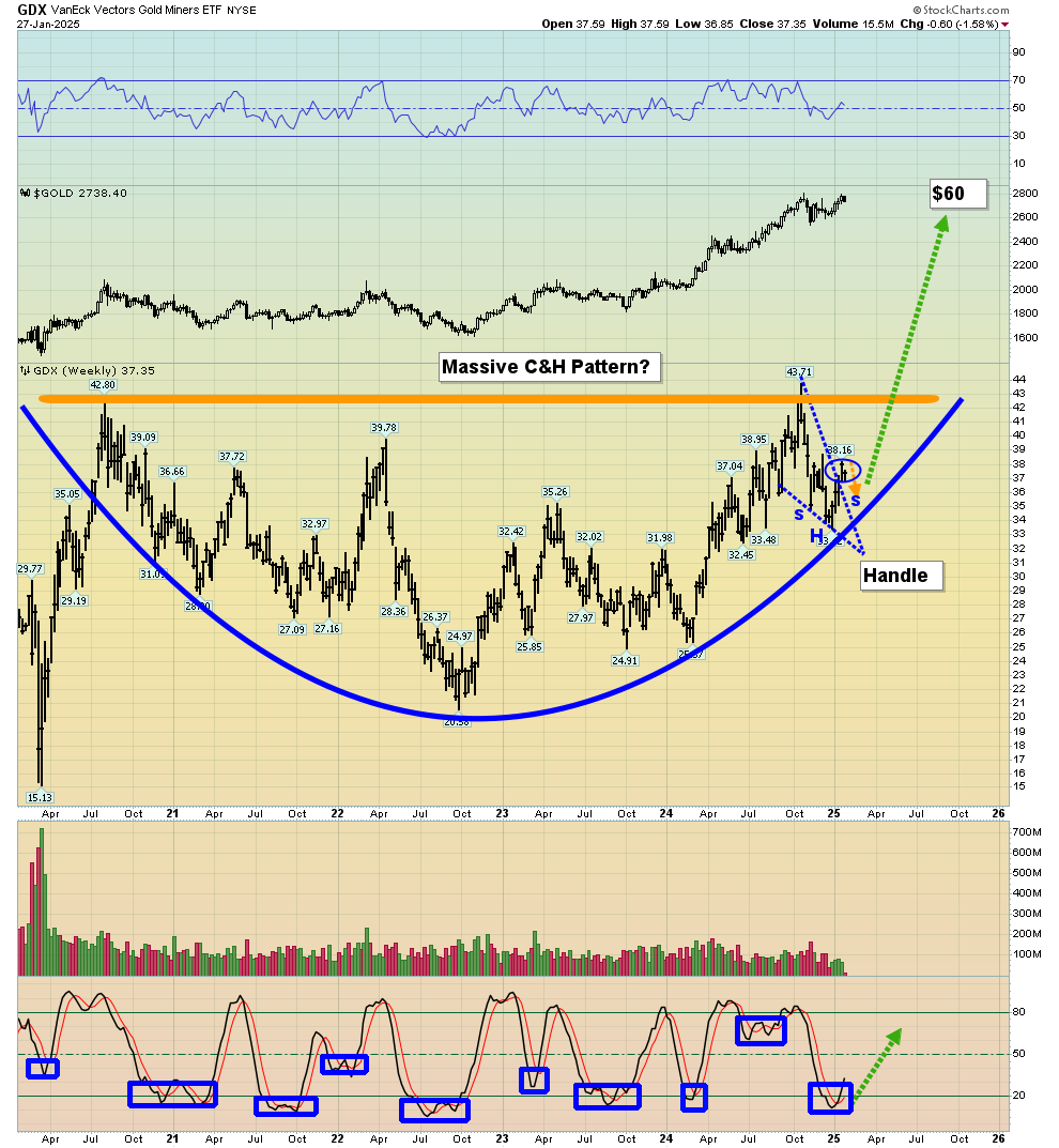 Es gibt ein massives C&H-Muster mit einem Bullenkeil als Griff, und innerhalb dieses Musters gibt es eine inverse H&S-Aktion. Die Stochastik (14,5,5er-Reihe) zeigt ein donnerndes Kaufsignal an. Die Quintessenz: Es ist eine glorreiche Zeit für Gold-, Silber- und Minenaktien-Investoren auf der ganzen Welt. In China ist es das Jahr der Schlange, und dieser fantastische Chart zeigt, dass GDX sich aufgerollt hat... und bereit ist, einen Angriff auf die Allzeithochs im Bereich von $60-$65 zu starten!"Jan 28, 2025 A Golden Age Begins Now? Stewart Thomson 321gold ...inc ...s