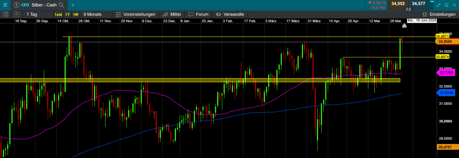 Und wer gegen 33.69, 34 und 34.56 gespielt hat, die als zeitlich näher liegende Marken stärker wirken sollten als alte, wurde gnadenlos überrannt. Aber wer im Chart sucht, findet fast immer was.