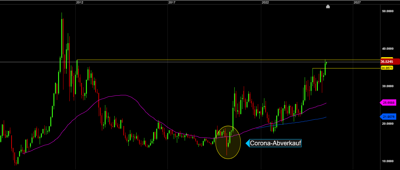 Ich will nicht sagen, dass das schlimm sei, ich möchte aber darauf hinweisen, dass wir am 18. Juni eben doch an den 37.1 $ von 2012 abgeprallt sind. Ich gehe aber auch davon aus, dass wir diesen Widerstand spätestens im September knacken sollten.