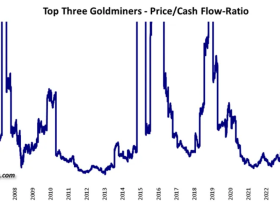 Das Kurs-Cashflow-Verhältnis (P/CF) ist aussagekräftiger, da es besondere Bilanzwirkungen und Wertberichtigungen ausschließt. Es zeigt, wie viel Anleger bereit sind, für den tatsächlichen Cashflow eines Unternehmens zu zahlen – und damit, ob Goldminenaktien am Markt als teuer oder günstig gelten. Wenn der Goldpreis deutlich fällt, schrumpfen die Margen und das Verhältnis schießt in die Höhe. Dann erscheinen die Aktien teuer, obwohl ihre Kurse in der Regel bereits deutlich gefallen sind.