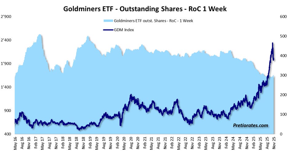 "Nach Jahren der Stagnation hat die Bergbauindustrie in letzter Zeit wieder an Aufmerksamkeit gewonnen. Mit dem Anstieg der Gold- und Silberpreise zog auch die Nachfrage nach Bergbauaktien an. Seit seinem Tiefpunkt im Frühjahr 2024 hat der GDM-Goldminenindex mehr als 170 Prozent zugelegt – eine spektakuläre Erholung in weniger als zwei Jahren. Dennoch blieb der große Geldfluss aus. Die Welt der passiven Anlagen, die mittlerweile mehr als die Hälfte des globalen Anlagevolumens kontrolliert, hat Goldminen ignoriert. Ein Blick auf die ausstehenden ETF-Anteile spricht Bände: Trotz steigender Preise sind sie deutlich zurückgegangen. Offenbar konzentrierten sich viele Anleger eher auf physisches Metall als auf Aktien – und nach dem starken Anstieg dürften viele Bergbauaktien nun als «zu teuer» angesehen werden.