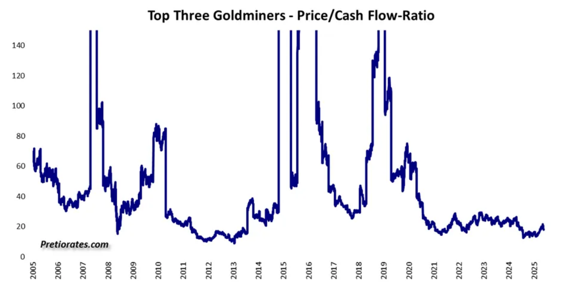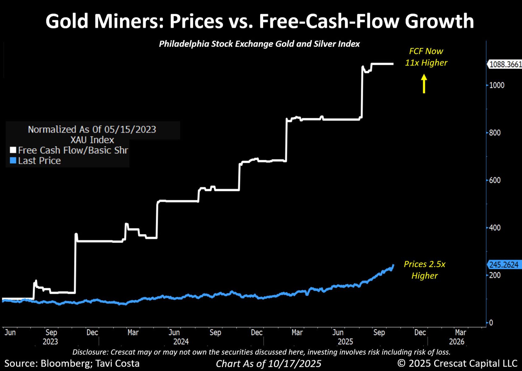 Otavio (Tavi) Costa (@TaviCosta) auf XMining stocks are likely overreacting today, in my view. Put loosely, these companies are effectively printing money at current gold prices. Yes, mining…x.comLese ich das richtig? Während sich Kurse der Miner um 2,5 x erhöht haben hat der FCF derselben um 11 x zugenommen? Da klafft also eine Lücke von ca. 4 x (um von 2,5 x auf ca. 11 x zu kommen?) Und wenn wir jetzt davon ausgehen dass Gewinne und damit wohl auch FCF weiter steigen - wohin sollen dann die Kurse der (bereits gut gelaufenen) Miner hin steigen???