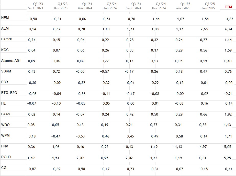 Es gibt noch mehr Schwachmaten in dieser Tabelle( neben schon genannten auch B2Gold) , aber auch positive Beispiele wie NEM,Kinross und PAAS.