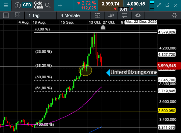 Wir haben heute exakt auf dem 38.2er Fibo Retracement aufgesetzt. Dort befinden sich zudem eine kleine horizontale Unterstützung und die 4'000er Marke. Das sollte jetzt reichen.