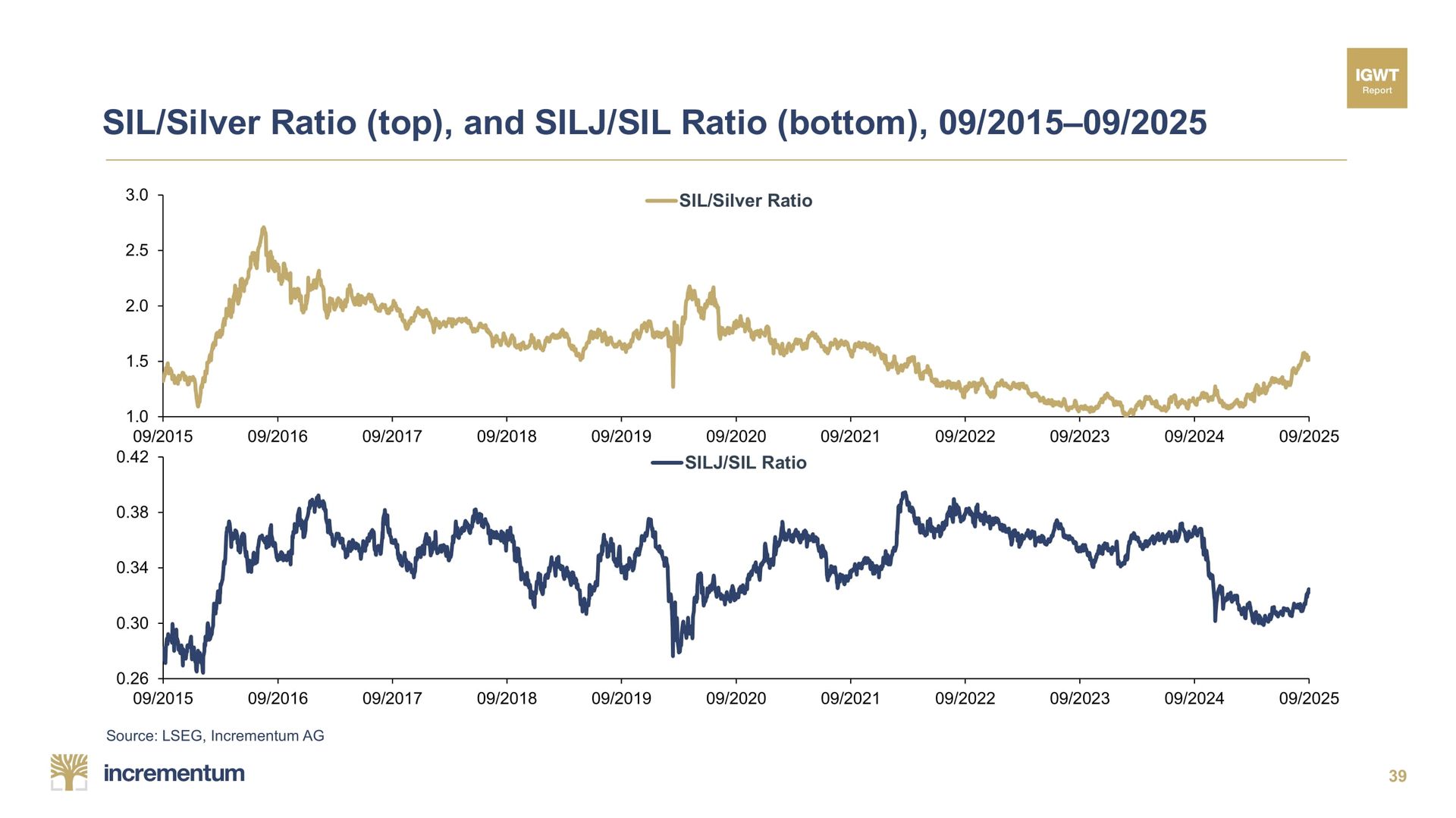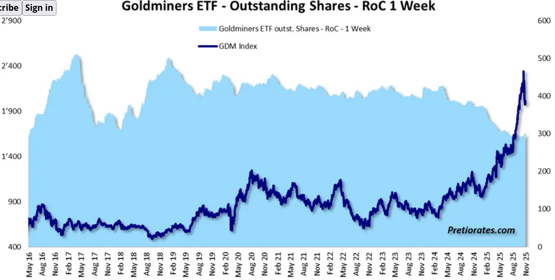 "Nach Jahren der Stagnation hat die Bergbauindustrie in letzter Zeit wieder an Aufmerksamkeit gewonnen. Mit dem Anstieg der Gold- und Silberpreise zog auch die Nachfrage nach Bergbauaktien an. Seit seinem Tiefpunkt im Frühjahr 2024 hat der GDM-Goldminenindex mehr als 170 Prozent zugelegt – eine spektakuläre Erholung in weniger als zwei Jahren. Dennoch blieb der große Geldfluss aus. Die Welt der passiven Anlagen, die mittlerweile mehr als die Hälfte des globalen Anlagevolumens kontrolliert, hat Goldminen ignoriert. Ein Blick auf die ausstehenden ETF-Anteile spricht Bände: Trotz steigender Preise sind sie deutlich zurückgegangen. Offenbar konzentrierten sich viele Anleger eher auf physisches Metall als auf Aktien – und nach dem starken Anstieg dürften viele Bergbauaktien nun als «zu teuer» angesehen werden.