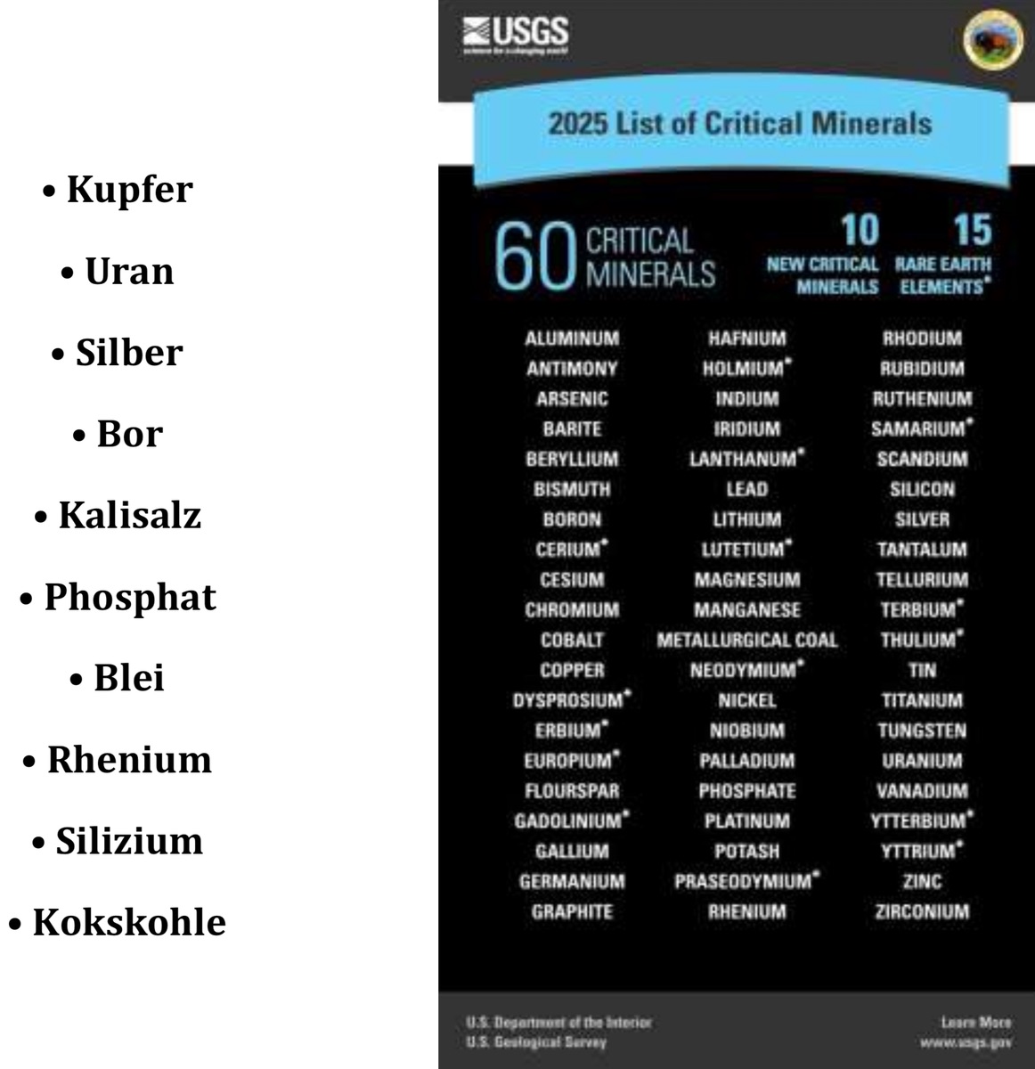 Das U.S. Geological Survey (USGS) hat im Rahmen der Aktualisierung der „List of Critical Minerals“ für 2025 offiziell sowohl Copper (Kupfer) als auch Silver (Silber) als kritische Mineralien ausgewiesen.