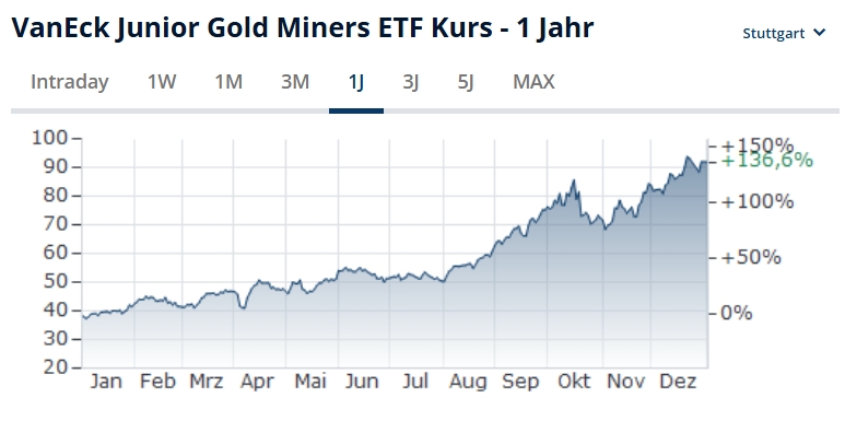 Meine beiden Goldminen-ETFs sind binnen Jahresfrist 119 % bzw. 136 % im Plus: