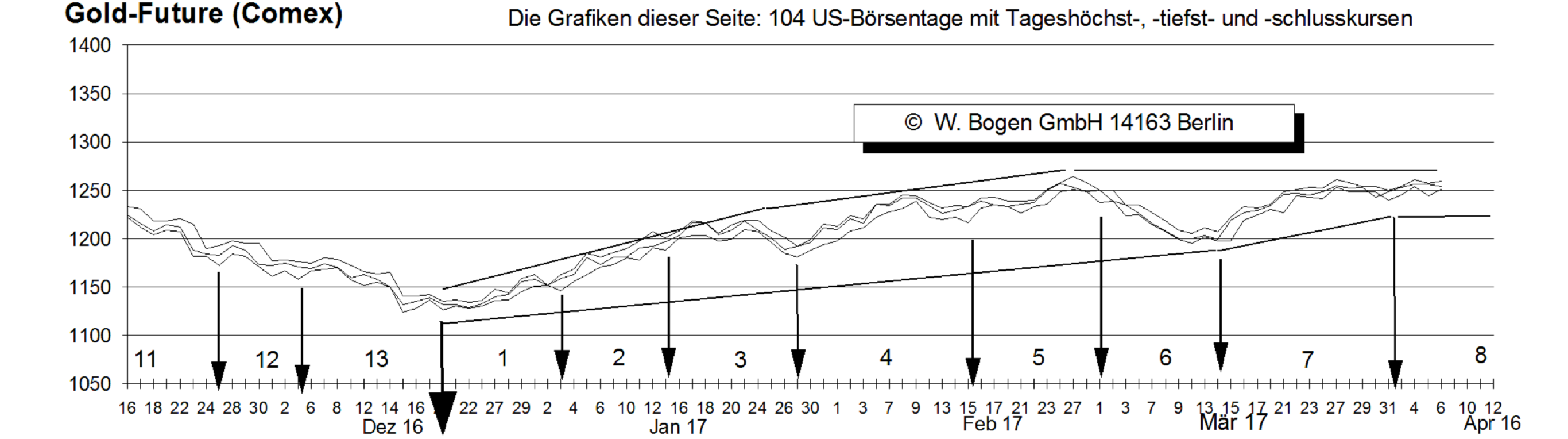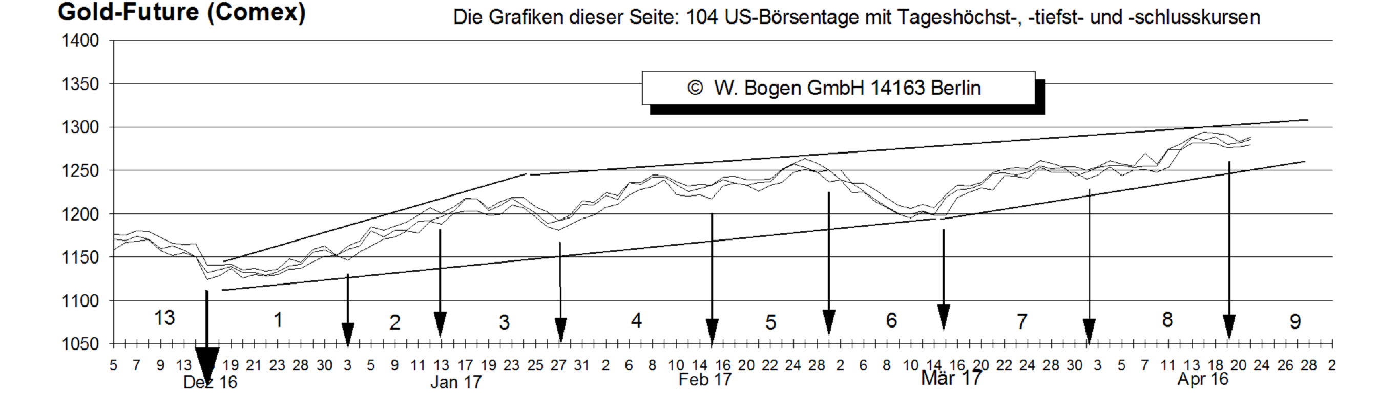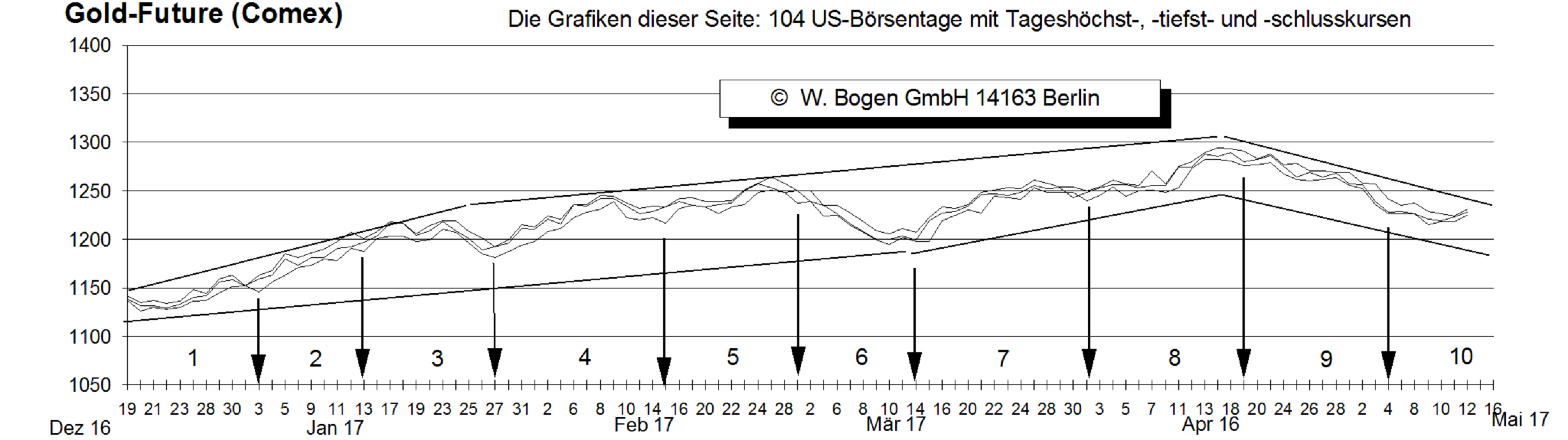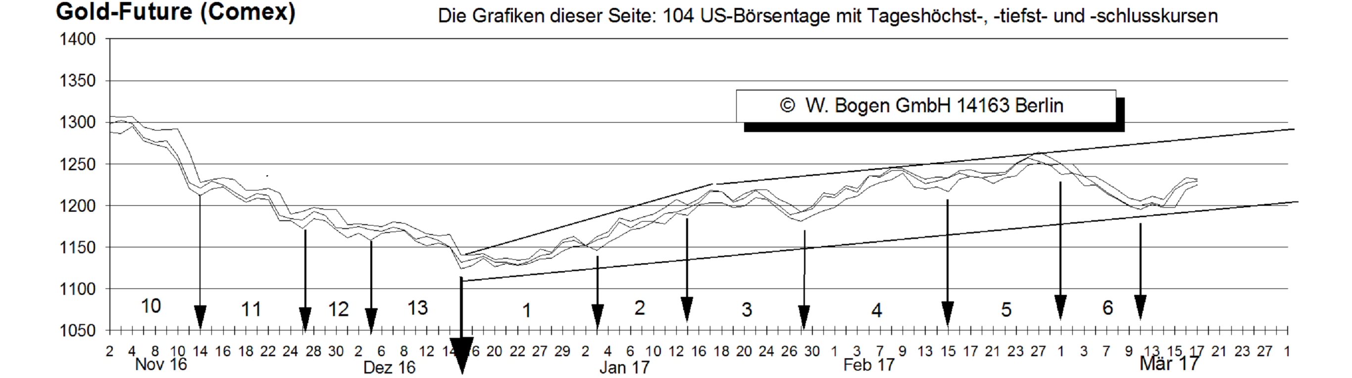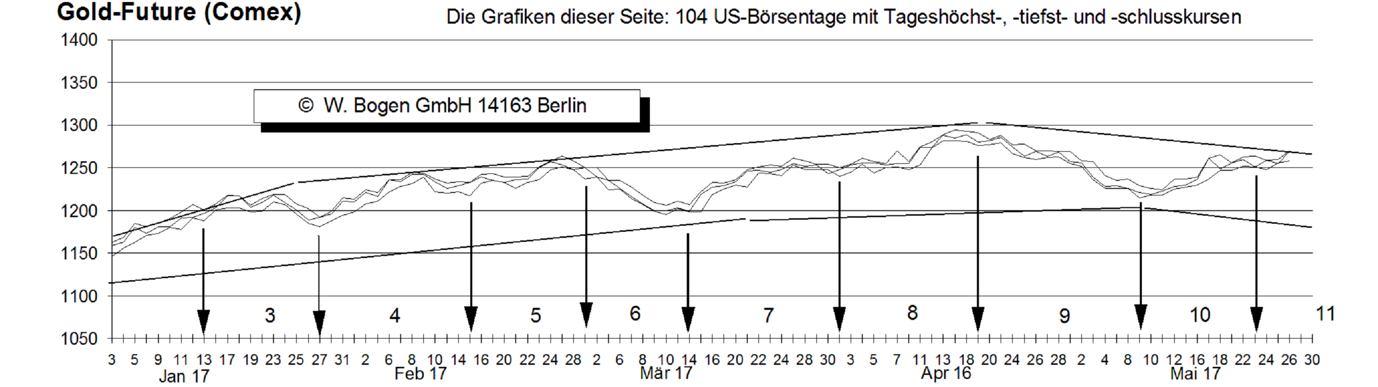 "Zum Gold schrieb ich: „Eine überraschende Wende entstand im Verlauf des Goldkurses, weil nach dem Ende des Zyklus Nr. fünf ein Abwärtstrend begann. Ich hoffe jedoch, dass diese Ansicht täuscht.“