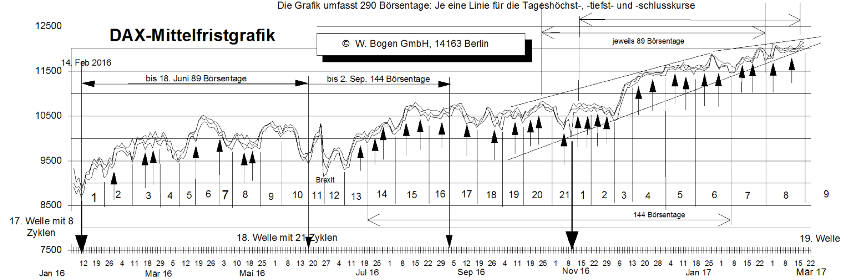 Der ... Dow-Jones-Index befindet sich in einem 21. Zyklus (Fibonacci-Zahl) und dürfte seinen Hochpunkt überschritten haben. Im Finanzteil der FAZ vom 8.3.17 stand der wichtige Satz: „Anleger, die nicht damit rechnen, dass Trump seine Pläne noch in diesem Jahr umsetzen kann, sollten sich von ihren Beteiligungen trennen. Und zwar sofort.“"