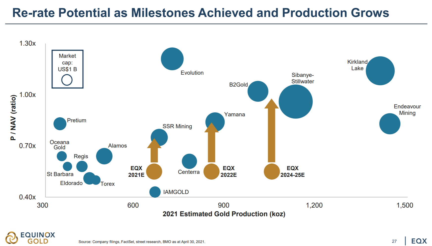 Und auch wenn Los Filos kein Qualitätsprojekt ist, wegen dem Länderrisiko Mexiko und den vergleichsweise hohen AISC, so ist es dennoch eine riesige Mine, die einen hohen Hebel auf den Goldpreis hat. Durch das hohe Produktionsvolumen kann EQX überhaupt erst in die Senior-Liga aufsteigen und kommt dazu irgendwann zu einer entsprechenden Neubewertung.