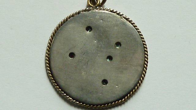 Die Rückseite ist nicht erkennbar da die Münze in ein Silberblech gefasst und gehenkelt wurde. Zudem sind 3 Brillianten und 2 Rubine in Form eines Kreuzes eingearbeitet (Steine sind auf Echtheit geprüft).