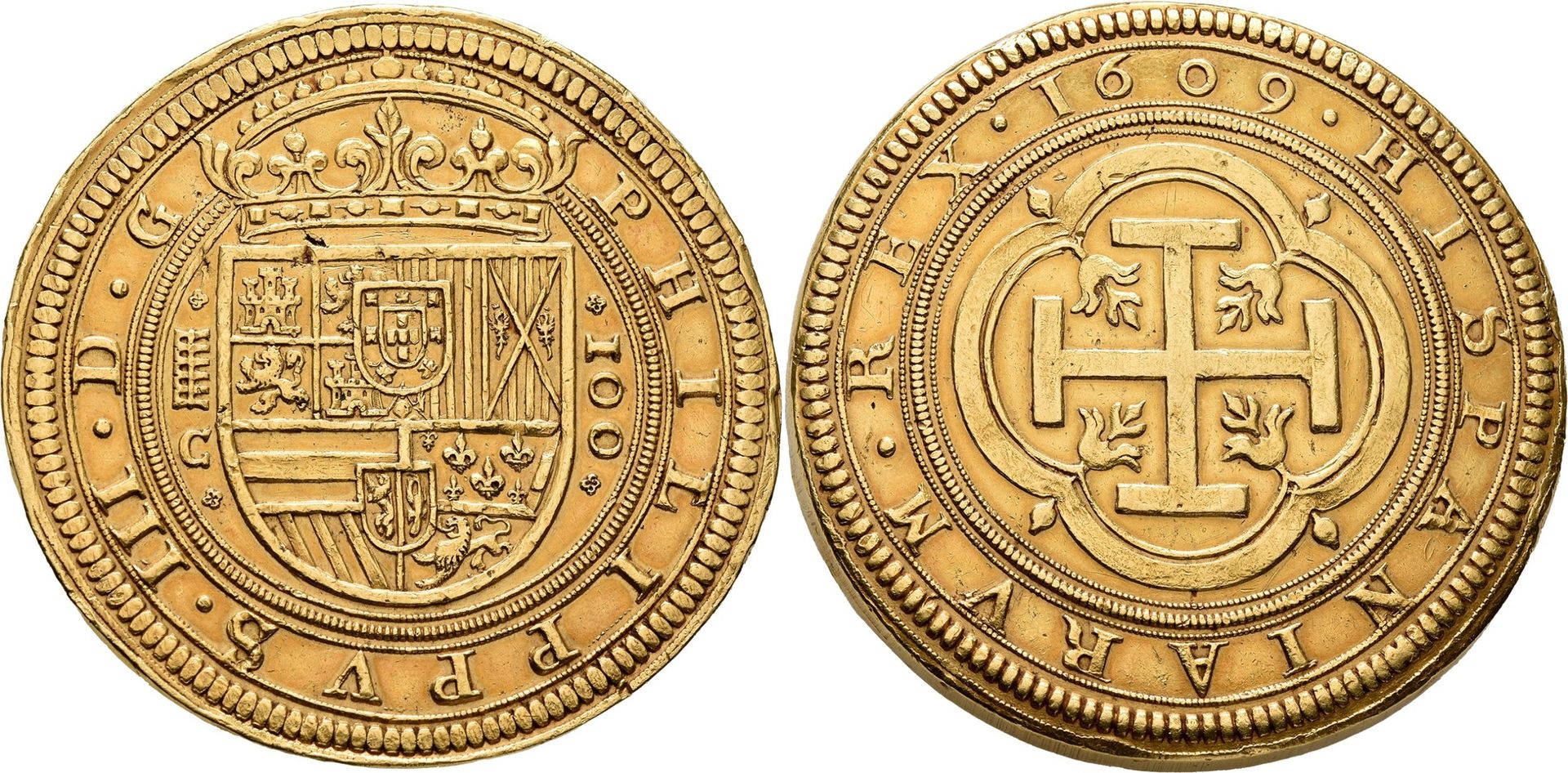 Noch eine etwas größere Münze aus Spanien, für Philipp III die erste 100 Escudo Münze