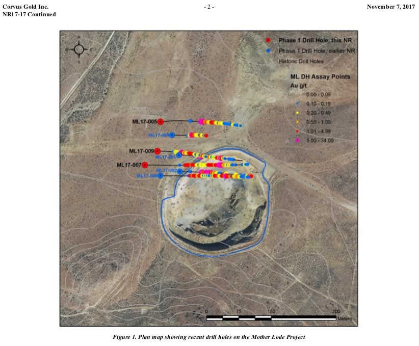 "..Corvus Gold Inc. has received further assay results from 10 new drill holes from its 2017 phase 1 drill program at the Mother Lode project in southern Nevada. The latest results include northwest and deep in-pit drilling, as well as stepout drilling to the west highlighted by hole ML17-020, which returned 96.0 metres at 1.35 grams per tonne gold and 1.24 g/t silver. Results continue to expand high-grade zones both laterally and at depth, which is potentially increasing the overall size and grade of the Mother Lode deposit...