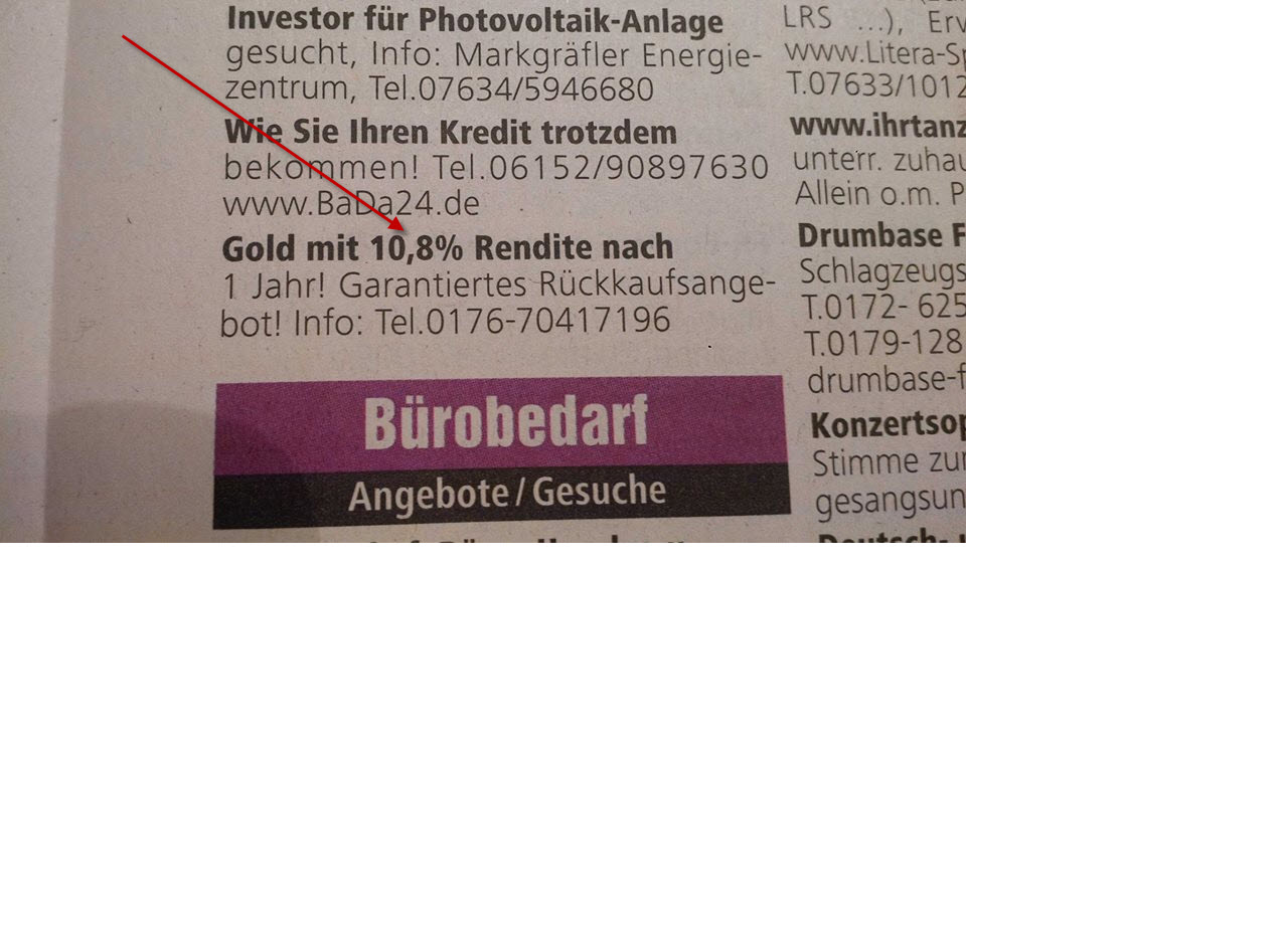 gestern in einem Anzeigenblatt in Freiburg gefunden: 10,xy% garantierte p.a.-Rendite mit Gold.... ich war in der Schule, habe eine Banklehre, ein wenig BWL geschnuppert, arbeite so ein oder zwei Jährchen mit Gold und Silber... und weiß trotzdem nicht, wie er das macht... warum nur bin ich so doooooof ?