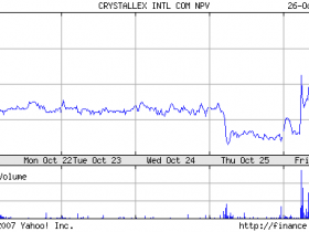 Meanwhile, Chavez is not just content anymore to take over oil and gas companies, but all of a sudden, utilities and other public companies are on his take-over list and now he’s even decided to shut down television stations, particularly popular ones that might actually not worship at his feet.Which gets us to Crystallex Intl. According to the Dow Jones Newswires today, “Venezuela’s mining ministry plans to turn over a new mining law to President Hugo Chavez for approval in two weeks, a minister said Monday.”