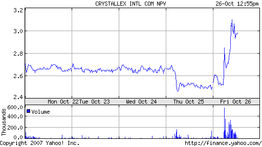 Meanwhile, Chavez is not just content anymore to take over oil and gas companies, but all of a sudden, utilities and other public companies are on his take-over list and now he’s even decided to shut down television stations, particularly popular ones that might actually not worship at his feet.Which gets us to Crystallex Intl. According to the Dow Jones Newswires today, “Venezuela’s mining ministry plans to turn over a new mining law to President Hugo Chavez for approval in two weeks, a minister said Monday.”
