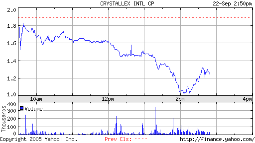 TORONTO, Sept. 14 /CNW/ - Crystallex International Corporation (TSX/AMEX: KRY) announced today that it has established a C$60 million equity draw down facility with Azimuth Opportunity, Ltd. and has also issued and sold to Azimuth for gross proceeds of C$10 million (received on closing) units comprising C$10 million aggregate principal amount of senior unsecured notes (Series 2) due March 13, 2006 bearing interest at the rate of 5% per annum, 200,000 common shares and warrants to acquire 450,000 common shares exerciseable on or before 5:00 p.m. (Toronto time) on September 13, 2006 at a price of C$3.19 per share (representing a 10% premium to the closing price of the Crystallex common shares on September 13, 2005). The securities comprising the units separated immediately upon issue. The net proceeds from the sale of the units will be used for working capital and general corporate purposes.