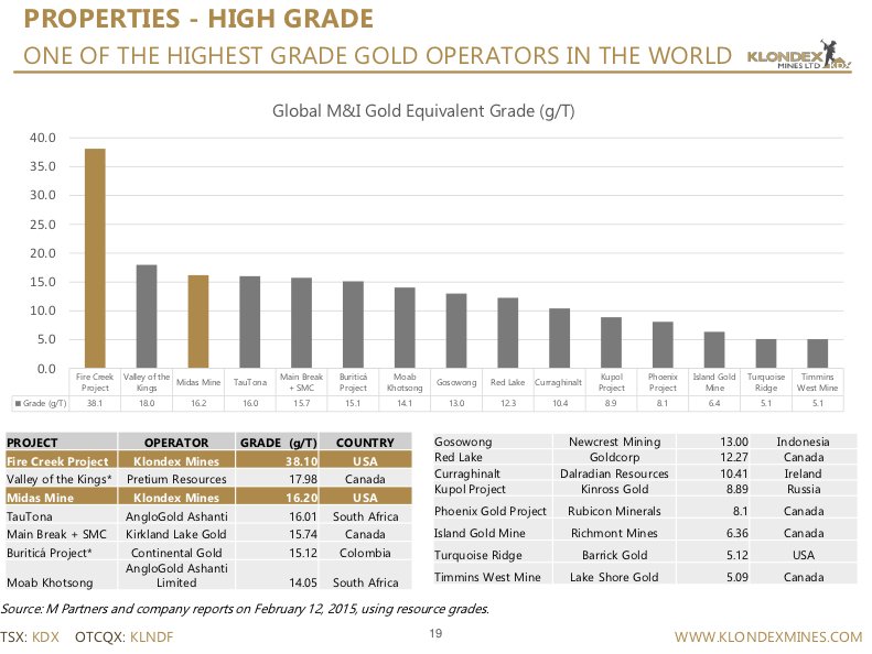 “We are encouraged by these high grade drill intercepts and the results of additional infill and exploration drilling at Fire Creek. All vein structures remain open along strike and up and down dip. Given this, Klondex continues to look to expand the life of the Fire Creek Project through its drilling programs.We intend to continue delineating the veins and increasing the quality of the mineral resource....“