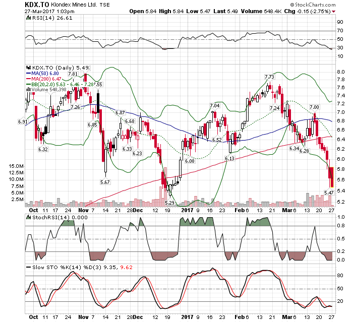 Der Blick auf den Chart zeigt, daß Klondex inzwischen stark überverkauft ist, alle gezeigten Indices auf Tiefststand.... Obwohl Klondex trotz der starken Korrektur von knapp 40 % immer noch Depotschwergewicht ist, erwäge ich Zukauf und seis nur zum temporären schnellen Trade.