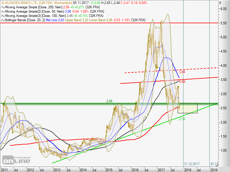 Ich bin nicht schlau bei den Minen, der chart ist zwar in Euro, aber unter 2,66 und 2,56 sollte es nicht gehen. Wir sind knapp darunter. Bei ca. 2,20 haben wir eine schönen Aufwärtstrend. Wenn es gut läuft ist 2018 noch Bodenbildung und dann 2019 schön aufwärts..Aber 2,20-2,50 sollte der Boden abgeschlossen sein.