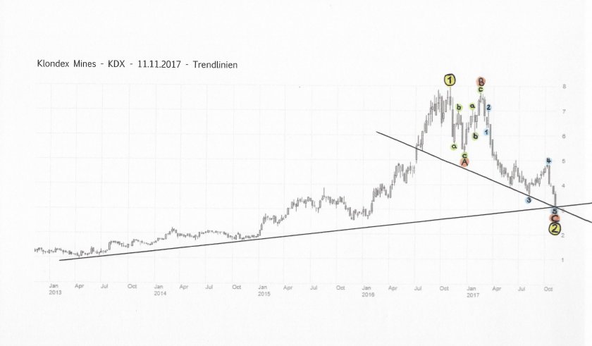 Mit dem gestrigen Tief bei 3,11 C$ hat KDX jetzt auf der sehr langfristigen Aufwärtstrendlinie aufgesetzt.