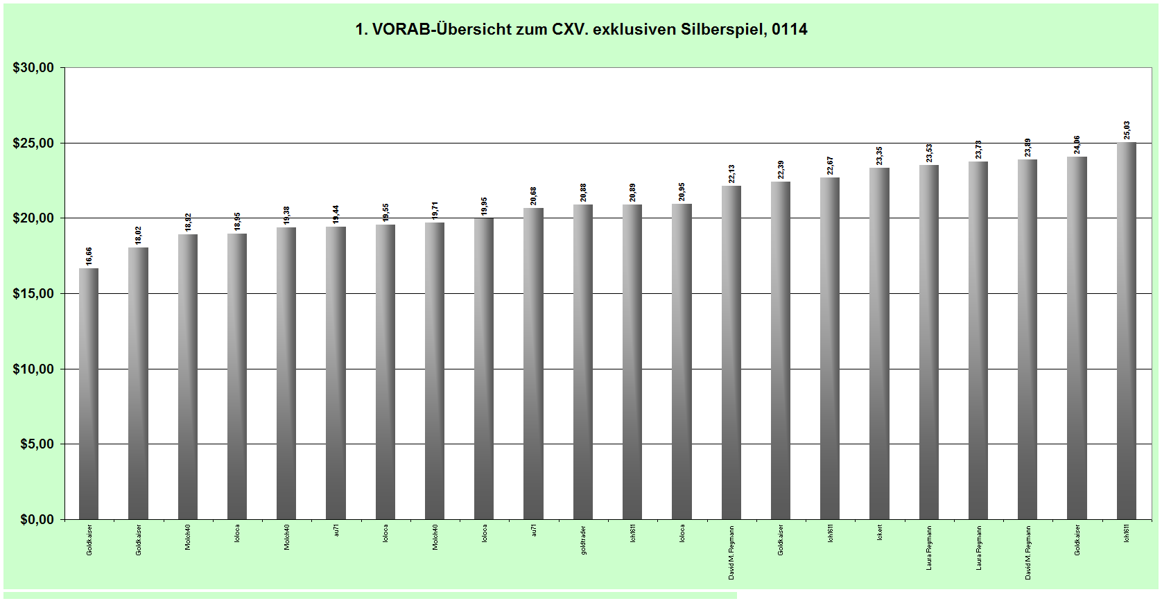- Gewinner unseres Spieles wird der Silberspieler sein, dessen Tipp zum letzen Handelstag des Spielmonats, dem tatsächlichen Silberkurs zu diesem Zeitpunkt am besten entspricht. Es gilt der Globex-Schlusskurs NY in US-$ 22:30 MEZ.